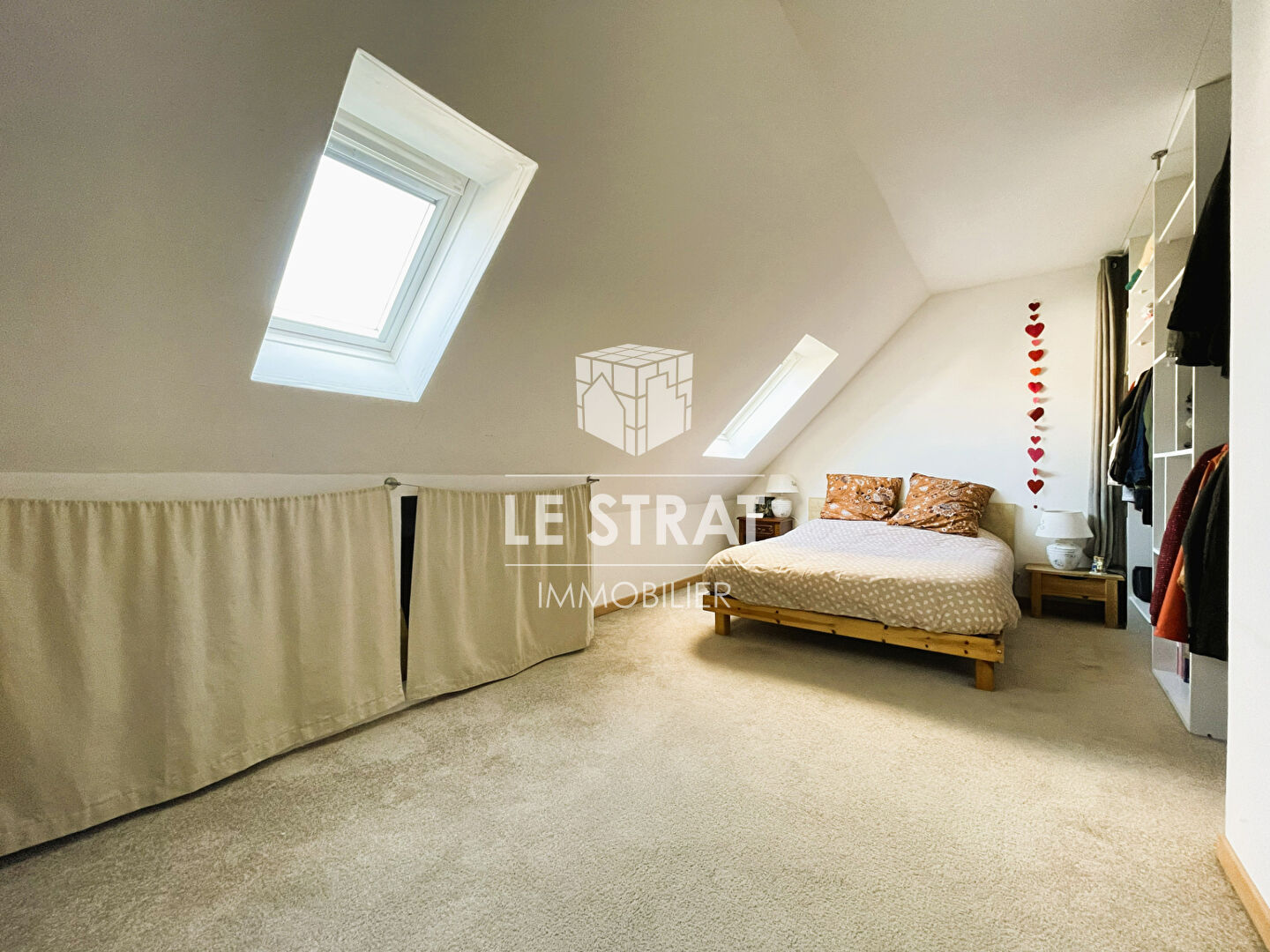 A l’étage, une vaste chambre avec dressing et rangements.